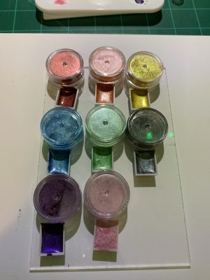 The last couple of days was learning how to mix the binder with the mica powders I had from a resin kit that I have yet to still attempt. I also learned the mulling process and utilized the new small watercolor making kit I purchased last month after making the binder.
