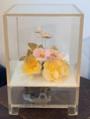 The music box was a clear acrylic box that contained some flowers and a butterfly on the inside. It would flutter when the music played.